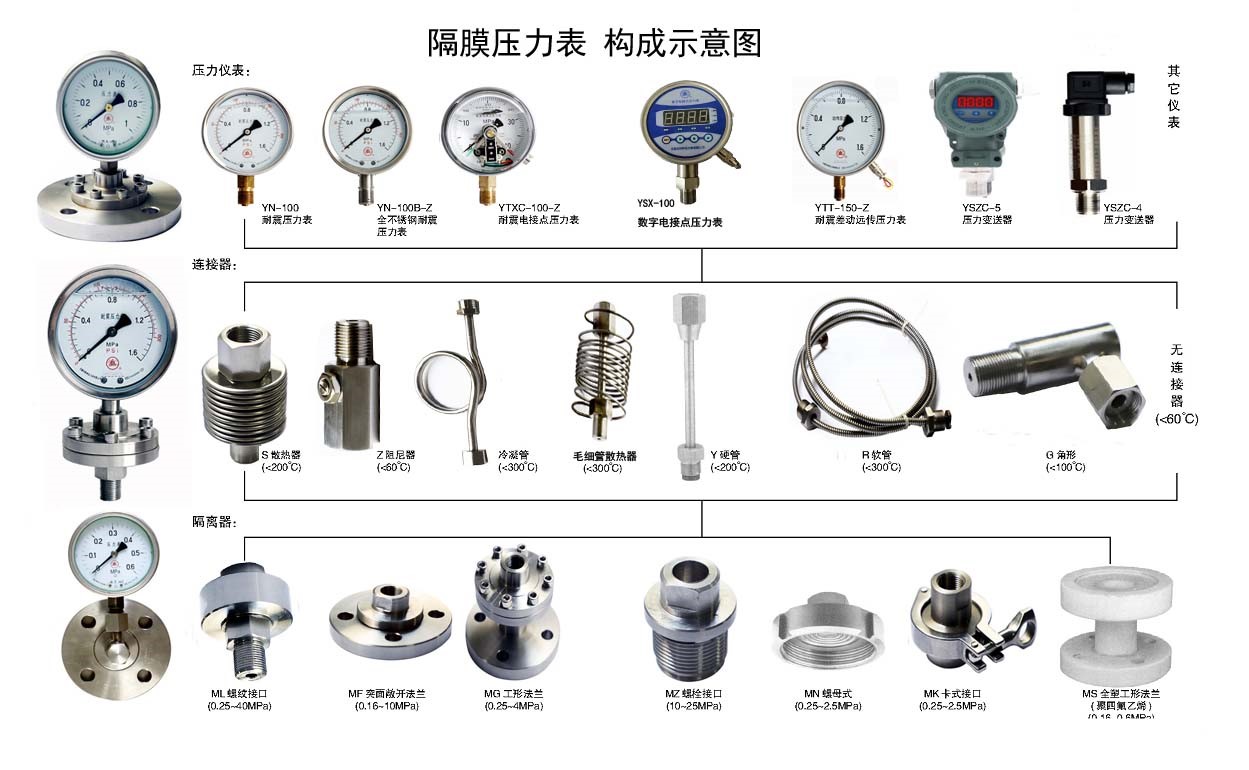 ◆ Aplicação: Devido à estrutura de medição indireta, o medidor de pressão do diafragma é adequado para medir a pressão de líquidos, gases ou sólidos que fluem granulares com alta viscosidade, fácil de cristalizar, forte corrosão e alta temperatura. O diafragma de isolamento possui uma variedade de materiais para se adaptar a uma variedade de diferentes meios corrosivos.